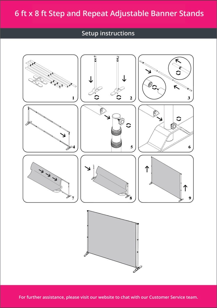 The 6' x 8' step and repeat banner stand easily sets up and wraps up without any hassle of additional tools, built for a long, uncompromising performance. Applicable at expos, red carpet events and other high profile occasions. Enhance your setup with optional accessories like a red carpet and crowd control stanchions with velvet ropes, available at an additional cost. With multiple shipping options, timely delivery is assured. These banner stands are easy to maintain, promoting their long-term durability and value. Benefit from our bulk order discounts on this affordable step and repeat banner stand.