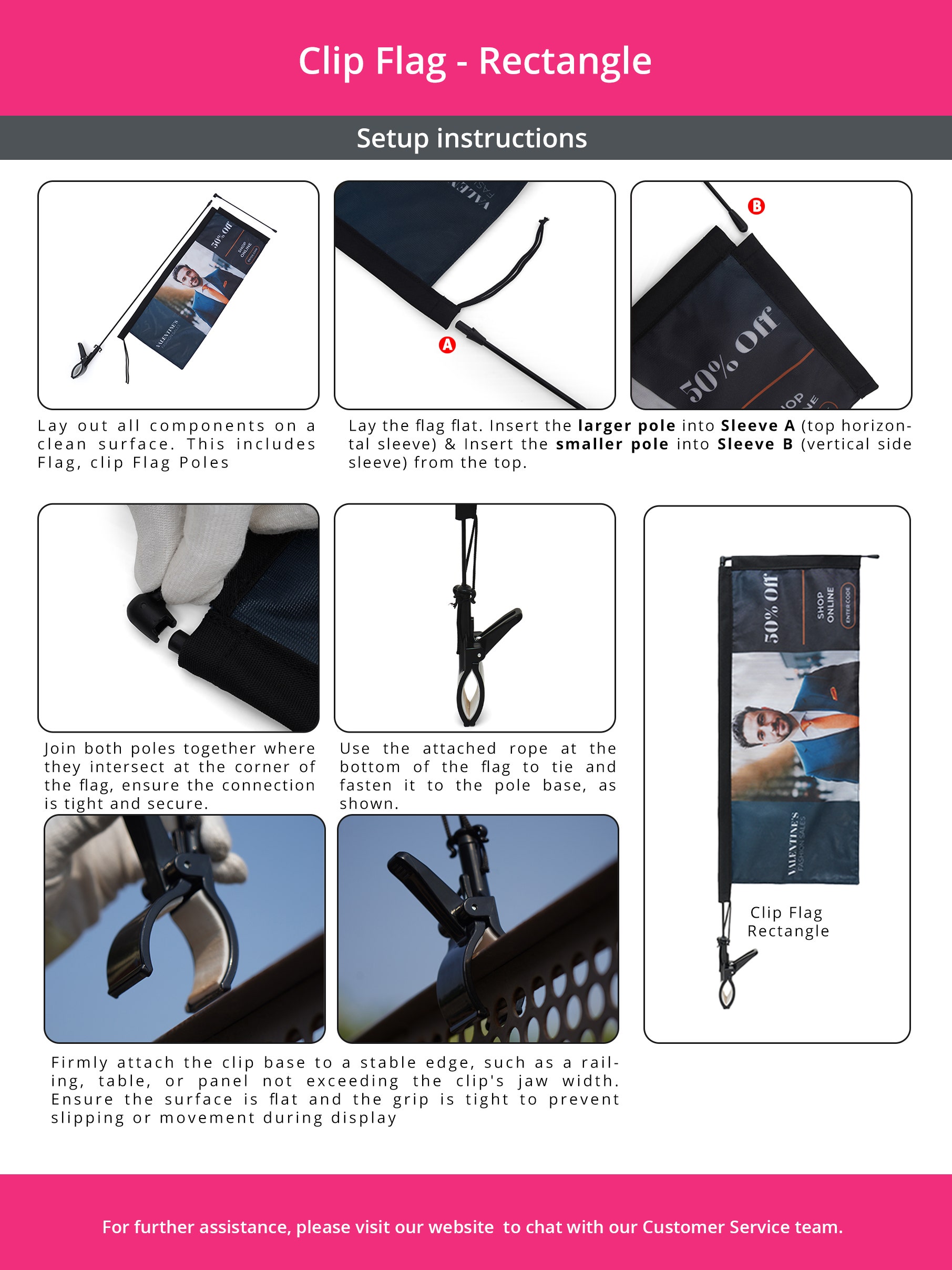 Draw attention effortlessly with our top-quality rectangle clip flags, designed to maximize the visibility of your business promotions. These flags are engineered for durability and visibility, making them an ideal solution for engaging potential customers at any event.
