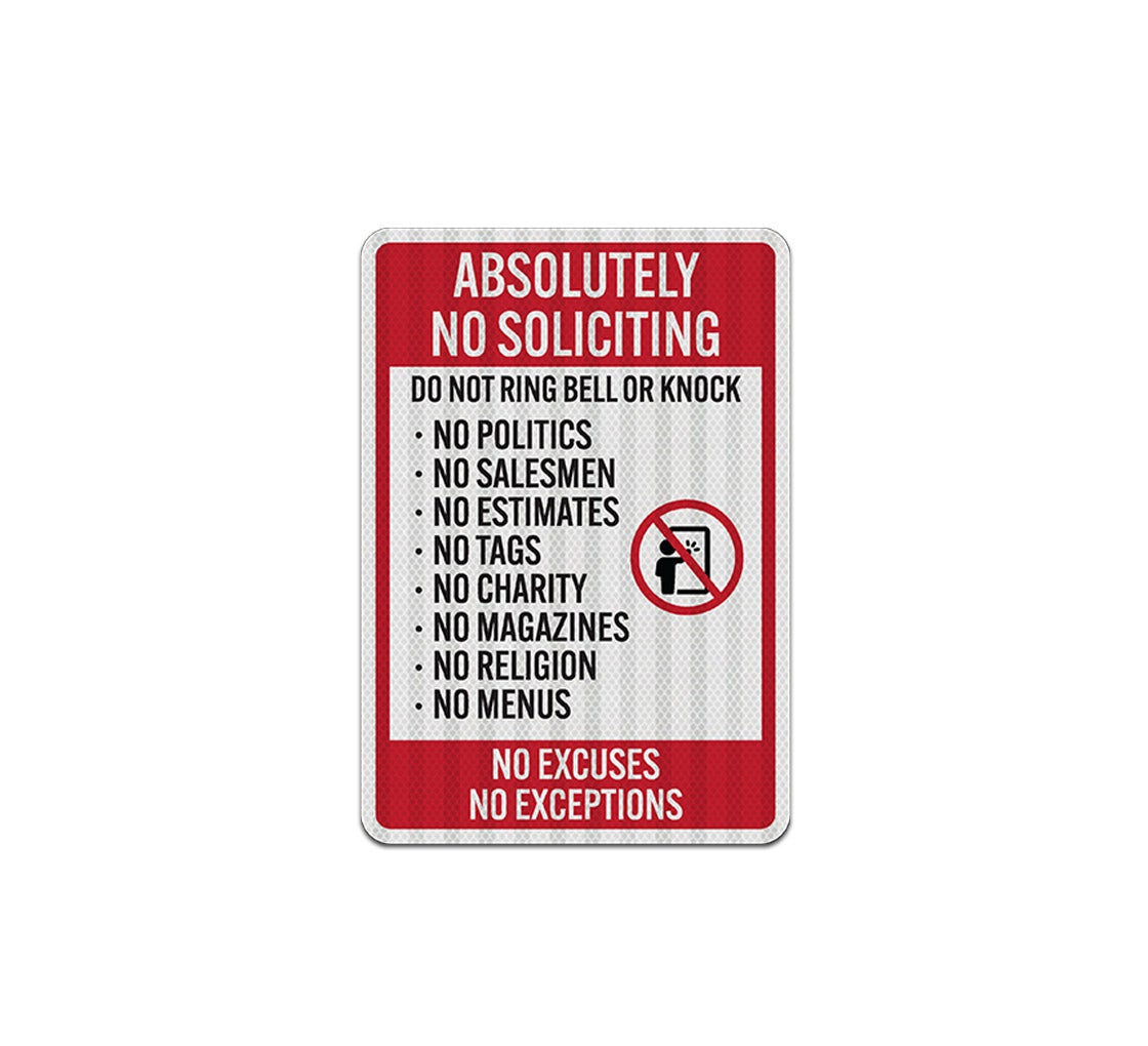 You can prevent solicitors and intruders from causing unwelcome disruption by placing a sign. Use our no excuses signs to tell visitors to not knock or ringing the doorbell.