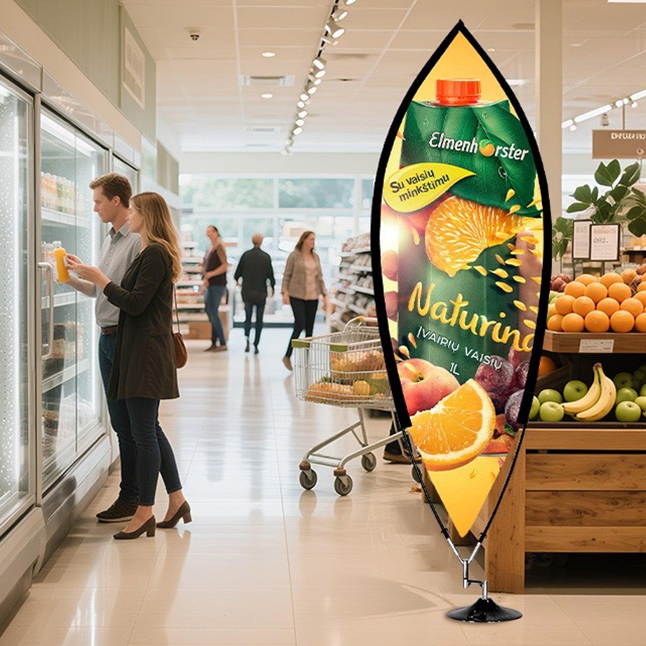 Set it up and notice how the curve catches light differently across the print. It can look still and sculptural one moment, then lively in a light breeze the next. From the pavement outside a café to the entrance of a sports event, the leaf shape breaks monotony and makes passersby register your message without them quite realising why. Double-sided printing adds to the effect, making sure whichever way people approach, they see something worth a second glance.
