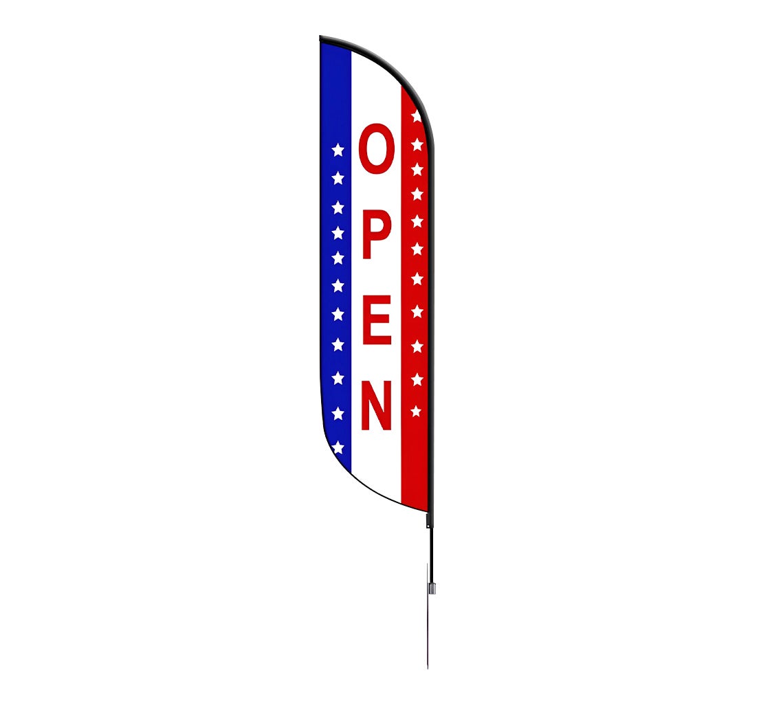 Announce your business's availability with our vibrant pre-printed open feather flag in red, white, and blue. Designed for maximum visibility, these feather flags are perfect for any new or reopening venture, ensuring that passersby know your doors are open.