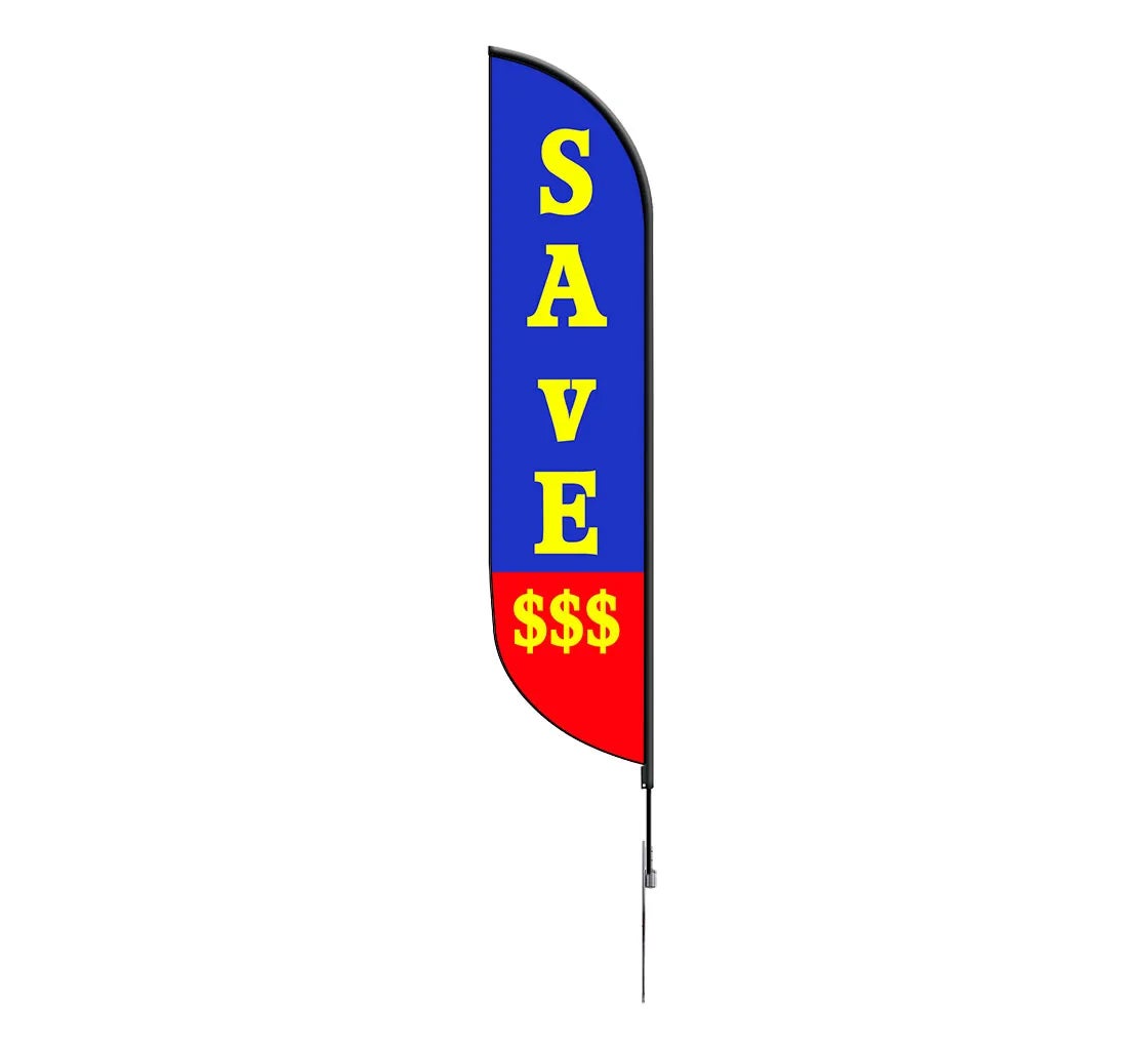Boost your business's visibility and attract more customers with the pre-printed save feather flags in blue. Designed to make a significant impact, these flags feature vivid colors and bold messaging, making them perfect for high-traffic areas.