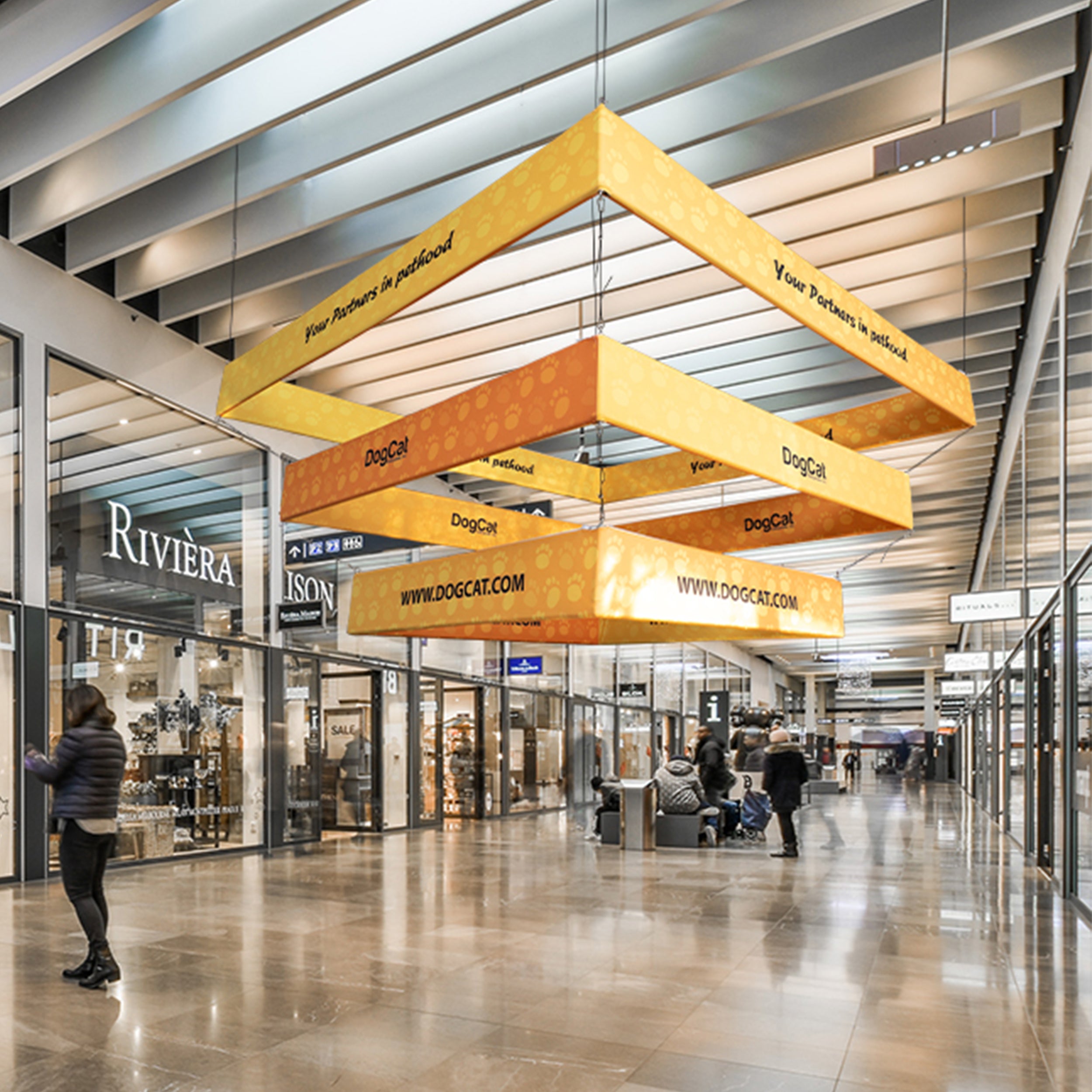 Steel cables and carabiners are rated for secure overhead suspension, with multiple anchor points per frame for stability. The 240 GSM flame-retardant fabric meets indoor fire safety regulations. Separate frame systems ensure the display remains functional even if one tier requires maintenance.