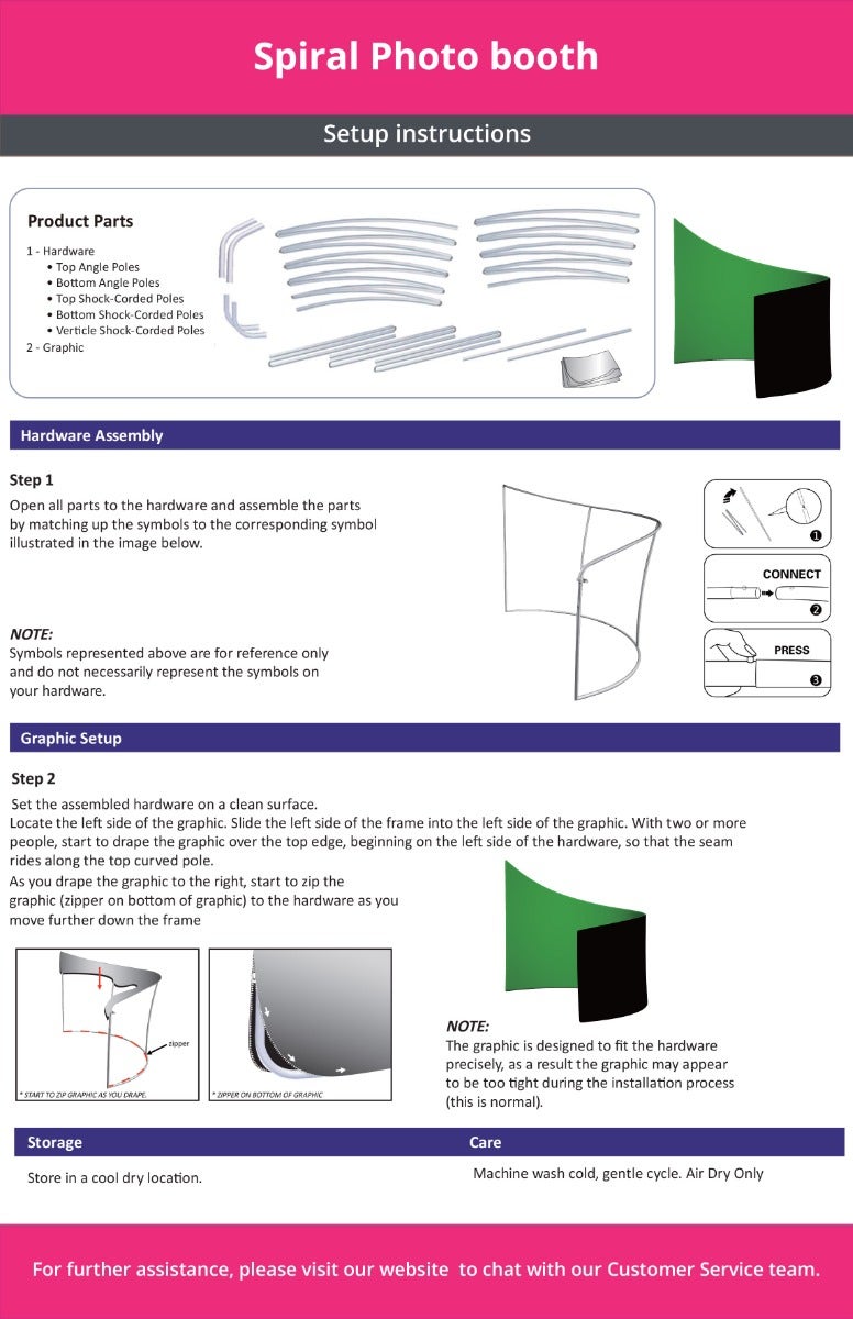 Maintain the beauty and energy of your Spiral Photo Booth with ease, thanks to our straightforward care guide. Suitable for both machine and hand washing with a mild detergent, the portable photo booth backdrop remains pristine time after time. With flexible drying options, including flat, drip-dry, or gentle tumble drying, keeping this premium item in top condition is a breeze.