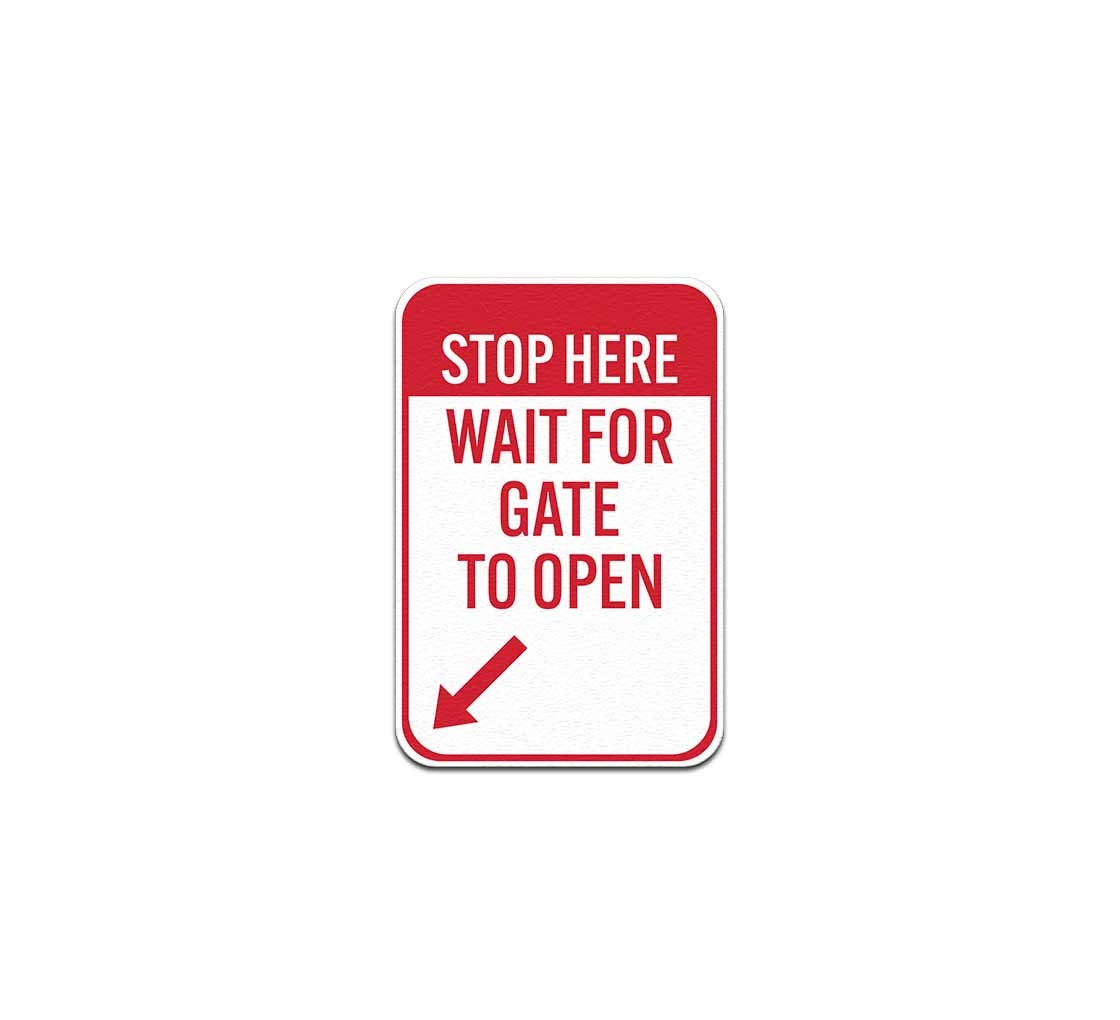 We manufacture these wait for gate to open signs from durable vinyl material with Kraft paper liner and pressure-sensitive adhesive that adheres well to sand cast, moderately rough surfaces, and some low surface energy materials. These stop here signs comprise rustproof aluminum base for added durability, making them ideal for use in any environment.