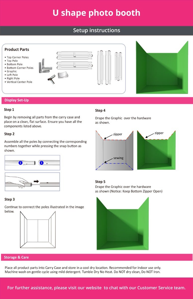 Following an unforgettable event, the last thing you need is a complicated cleanup. Our photo booths for sale feature easy-to-follow graphic maintenance instructions, ensuring a straightforward and effective process. You can choose between machine washing or hand washing with a mild detergent, keeping the fabric looking great with minimal effort. For drying, lay flat to achieve perfect results, or opt for drip-drying or tumbling on a low setting if you’re short on time. Choose our U Shape Photo Booth Enclosure for Immersive Experience for your photography needs.